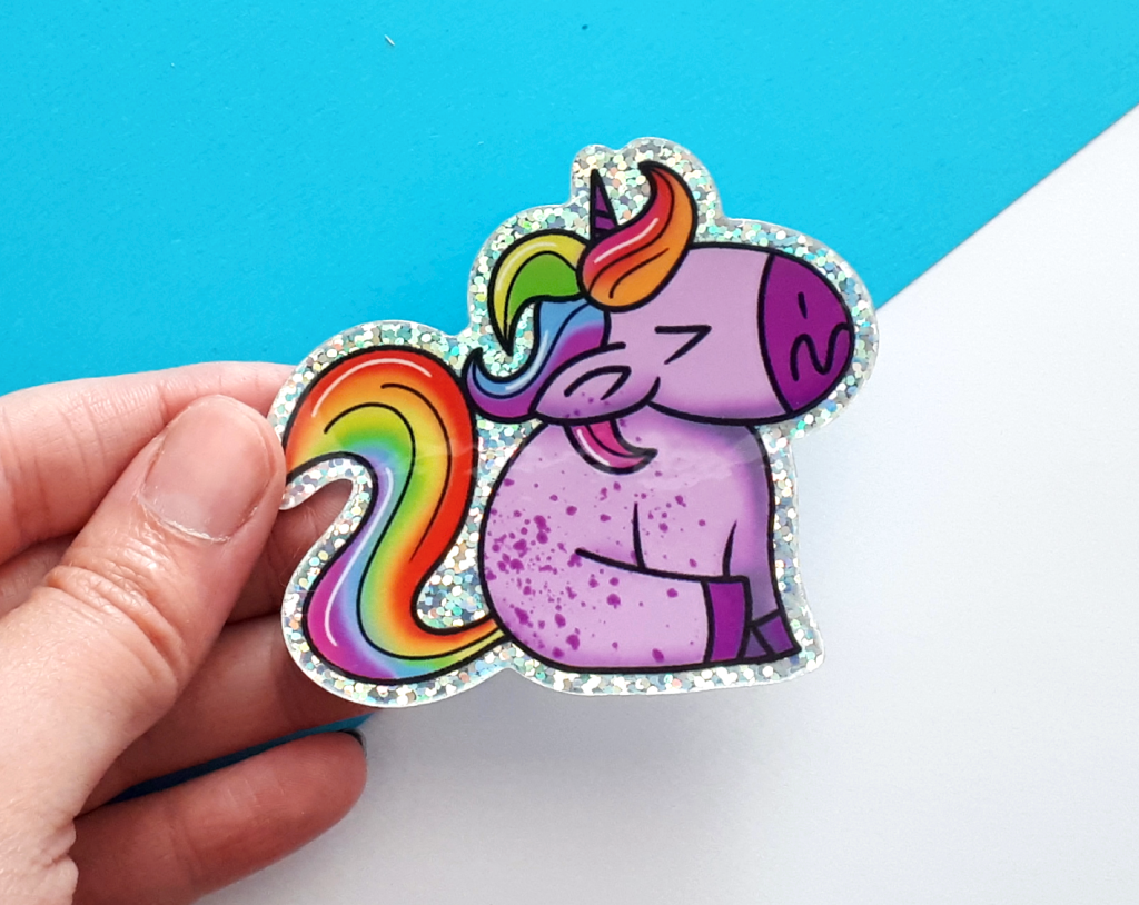 À part pour me vider le cœur, je vous en parle pour vous mettre à jour sur ce que mon entreprise est devenue. « Tu vas pas t’écœurer encore avec cette nouvelle affaire-là? » que tu vas me dire. Ouan, peut-être, peut-être pas. Mon but d’entreprise a vraiment beaucoup changé et j’ai vraiment pas envie de courir après une popularité vide. Des milliers de Likes sur Facebook qui ne valent rien dire. J’ai juste envie de dessiner mes ti cartoons pis de tripper de les voir prendre vie. C’est certain que je capote ma vie chaque fois que je fais une vente de collants. Écoute ben, je pensais jamais qu’en 10 mois de vie, je serais en mesure de vendre une licorne qui est incapable de faire caca. Et pourtant…! Mais reste que de la créer a tellement été drôle pis trippant. Au final je suis ben à l’aise avec le fait de créer pour moi d’abord et avant tout. Les ventes c’est juste comme une cerise fucking awesome sur le sunday, tsé.