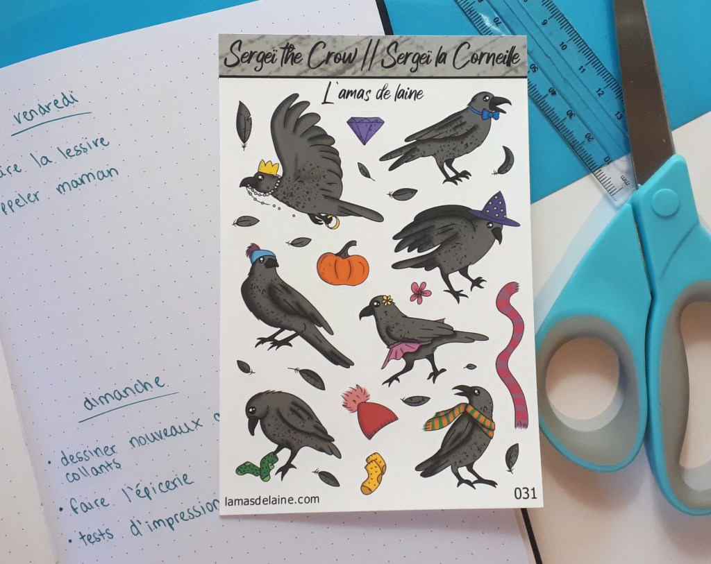 L’autre jour je me suis inventé un personnage. Une corneille. Parce que pendant que tout le monde trippe sur les majestueux geais bleus ou les sublimes paons, ben moé je suis super crampée en deux à voir une grosse criss de corneille essayé de manger les graines de ma toute petite mangeoire à ouézo. J’ai jamais capoté autant sur un gros oiseau laite pis gauche. Alors pendant que je l’imaginais porter un tutu pis mettre une tuque bleue (en demi-brides, la tuque, penses-tu?), ben des amis l’ont nommés Sergeï. Pis moi pis Sergeï, on est comme devenu chumé-chumé. Ça fait que je lui ai faite sa propre page d’autocollants. Pis tabarouette, je l’ai publié sur ma boutique pour le gros trip, pis vous autres, vous l’achetez ma gang de malade. Et je dis ça avec tout plein d’amour dans mon coeur.